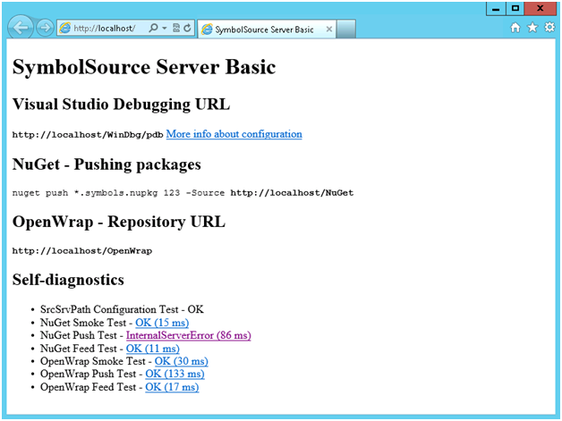 - Self-diagnostics - Very useful and very nice from the SymbolSource guys to provide this. This will help you verify whether the prerequisite is installed and your Web site is configured correctly to provide a fully functioning SymbolSource basic server. Shield this info from the public! No one needs to know...