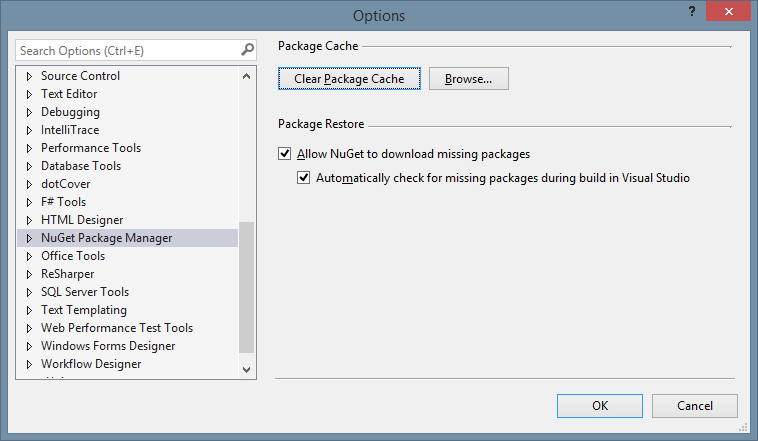 <Target Name="EnsureNuGetPackageBuildImports" BeforeTargets="PrepareForBuild"> <PropertyGroup> <ErrorText>This project references NuGet package(s) that are missing on this computer. Enable NuGet Package Restore to download them. For more information, see http://go.microsoft.com/fwlink/?LinkID=322105. The missing file is {0}.</ErrorText> </PropertyGroup> <Error Condition="!Exists('..\packages\SomePackageId\Build\SomeMSBuild.targets')" Text="$([System.String]::Format('$(ErrorText)', '..\packages\SomePackageId\Build\SomeMSBuild.targets'))" /> </Target>This is horrible as it is suggesting you to do the wrong thing: you should callnuget.exe restoreinstead! - The context menu-item to manually enable NuGet package restore (MSBuild-based) should be completely removed from the extension. I don't see any reason to keep it. Do you? If you do, please comment on this CodePlex issue, if you agree, then vote for it :)